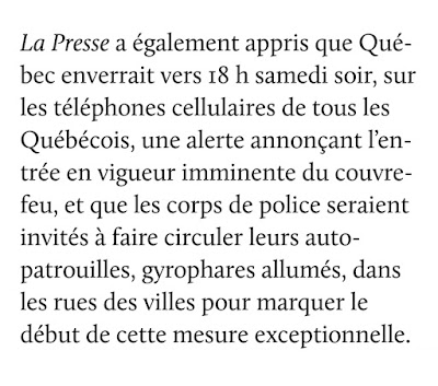 Et finalement, le couvre-feu est nocif en ceci qu’on en parle plutôt que de tout le reste, comme la ventilation déficiente dans les écoles, du matériel médical insuffisant, du traçage déficient, de notre système de santé soumis au régime néo-libéral depuis des décennies et qui était déjà à bout de souffle avant que cette marde ne commence, ou enfin du fait qu’à peu près rien d’autre n’a changé dans les mesures sanitaires, si bien qu’on est pas mal assuré qu’on sera dans un mois à la même place que maintenant.