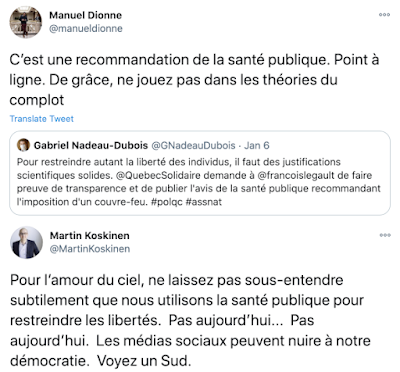 Quant au supposé gain sanitaire d’une telle mesure, il ne tombe pas spontanément sous le sens : l’immense majorité des contacts se font dans le jour, à l’école ou la garderie, sur les milieux de travail, et même ceux qui tombent sous le coup des interdictions se font, well, pendant que les gens sont éveillés. Les taouins qui se rassemblaient au mépris des directives sanitaires vont juste reporter leurs activités le jour. Quand Gabriel Nadeau Dubois a demandé le rapport de la sécurité publique recommandant une telle mesure, Legault a envoyé ses larbins sur Twitter :